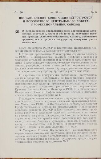 Постановление Совета Министров РСФСР и Всесоюзного Центрального Совета Профессиональных Союзов. О Всероссийском социалистическом соревновании автономных республик, краев и областей за получение высоких урожаев сельскохозяйственных культур, увеличе...