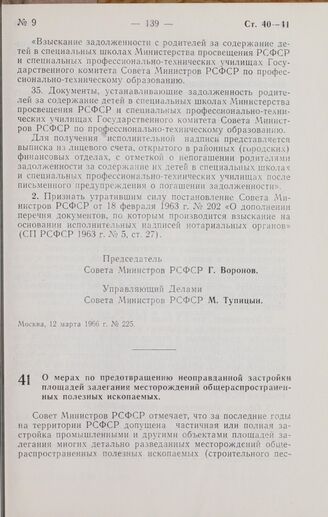 Постановление Совета Министров РСФСР. О мерах по предотвращению неоправданной застройки площадей залегания месторождений общераспространенных полезных ископаемых. 14 марта 1966 г. № 229
