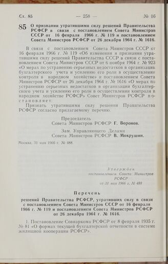 Постановление Совета Министров РСФСР. О признании утратившими силу решений Правительства РСФСР в связи с постановлением Совета Министров СССР от 16 февраля 1966 г. № 119 и постановлением Совета Министров РСФСР от 26 декабря 1964 г. № 1616. 31 мая 1966 г. № 488