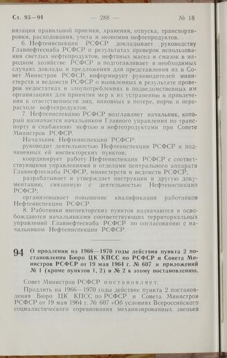 Постановление Совета Министров РСФСР. О продлении на 1966—1970 годы действия пункта 2 постановления Бюро ЦК КПСС по РСФСР и Совета Министров РСФСР от 19 мая 1964 г. № 607 и приложений № 1 (кроме пунктов 1,2) и № 2 к этому постановлению. 18 июня 1966 г. № 537