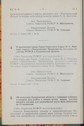 Постановление Совета Министров РСФСР. Об отнесении Кемеровской области к северным районам, в которых при работе в зимнее время нормы расхода жидкого топлива для автомобилей могут быть повышены до 15 процентов. 25 января 1967 г. № 50