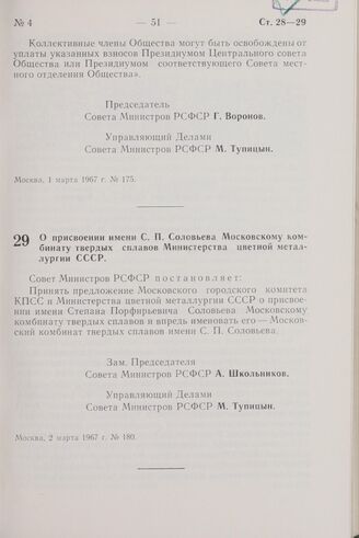 Постановление Совета Министров РСФСР. О присвоении имени С.П. Соловьева Московскому комбинату твердых сплавов Министерства цветной металлургии СССР. 2 марта 1967 г. № 180