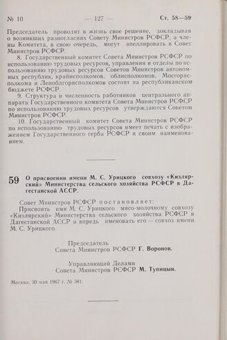 Постановление Совета Министров РСФСР. О присвоении имени М.С. Урицкого совхозу «Кизлярский» Министерства сельского хозяйства РСФСР в Дагестанской АССР. 30 мая 1967 г. № 381