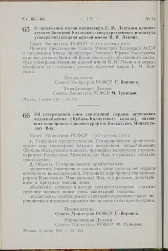 Постановление Совета Министров РСФСР. О присвоении имени профессора E.М. Лепского клинике детских болезней Казанского государственного института усовершенствования врачей имени В.И. Ленина. 3 июня 1967 г. № 400