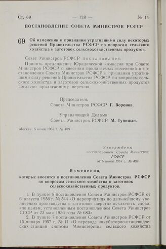 Постановление Совета Министров РСФСР. Об изменении и признании утратившими силу некоторых решений Правительства РСФСР по вопросам сельского хозяйства и заготовок сельскохозяйственных продуктов. 6 июня 1967 г. № 409