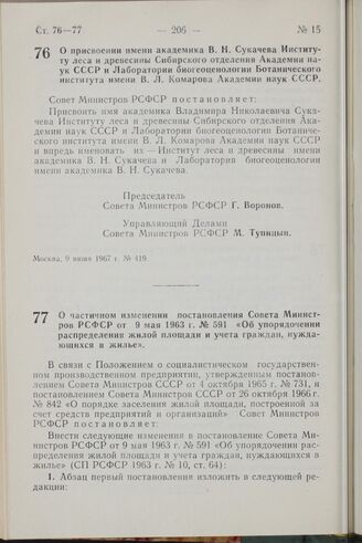 Постановление Совета Министров РСФСР. О присвоении имени академика В.Н. Сукачева Институту леса и древесины Сибирского отделения Академии наук СССР и Лаборатории биогеоценологии Ботанического института имени В.Л. Комарова Академии наук СССР. 9 июня 1967 г. № 419