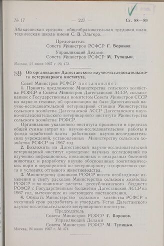 Постановление Совета Министров РСФСР. Об организации Дагестанского научно-исследовательского ветеринарного института. 24 июня 1967 г. № 474
