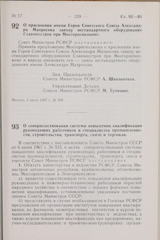Постановление Совета Министров РСФСР. О присвоении имени Героя Советского Союза Александра Матросова заводу нестандартного оборудования Главмосстроя при Мосгорисполкоме. 4 июля 1967 г. № 498