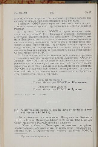 Постановление Совета Министров РСФСР. О неотложных мерах по защите почв от ветровой и водной эрозии в РСФСР. 5 июля 1967 г. № 503