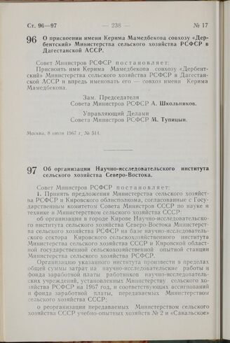 Постановление Совета Министров РСФСР. Об организации Научно-исследовательского института сельского хозяйства Северо-Востока. 10 июля 1967 г. № 518