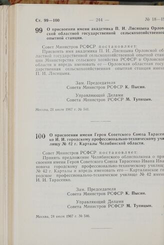 Постановление Совета Министров РСФСР. О присвоении имени Героя Советского Союза Тарасенко И.И. городскому профессионально-техническому училищу № 42 г. Карталы Челябинской области. 24 июля 1967 г. № 546