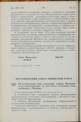 Постановление Совета Министров РСФСР. Об установлении зоны санитарной охраны Иваньковского водохранилища на реке Волге (источника водоснабжения г. Москвы). 29 августа 1967 г. № 651