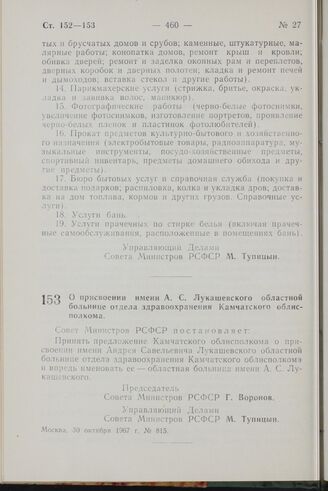 Постановление Совета Министров РСФСР. О присвоении имени А.С. Лукашевского областной больнице отдела здравоохранения Камчатского облисполкома. 30 октября 1967 г. № 815