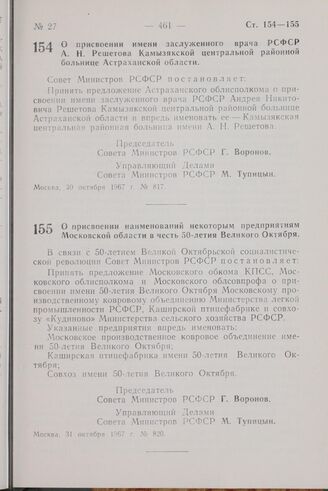 Постановление Совета Министров РСФСР. О присвоении наименований некоторым предприятиям Московской области в честь 50-летия Великого Октября. 31 октября 1967 г. № 820