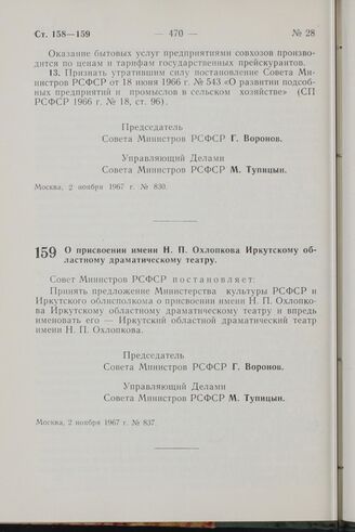 Постановление Совета Министров РСФСР. О присвоении имени Н.П. Охлопкова Иркутскому областному драматическому театру. 2 ноября 1967 г. № 837