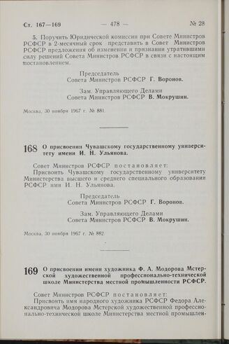 Постановление Совета Министров РСФСР. О присвоении Чувашскому государственному университету имени И.Н. Ульянова. 30 ноября 1967 г. № 882