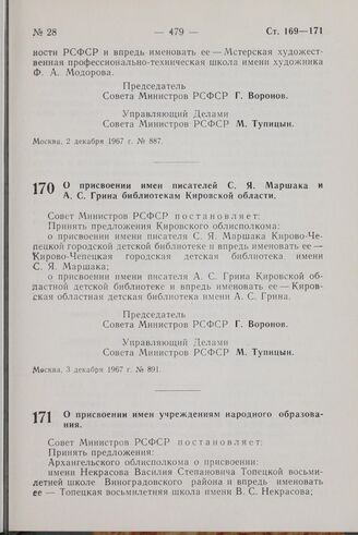 Постановление Совета Министров РСФСР. О присвоении имен учреждениям народного образования. 7 декабря 1967 г. № 894