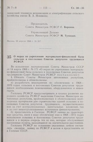 Постановление Совета Министров РСФСР. О мерах по укреплению материально-финансовой базы сельских и поселковых Советов депутатов трудящихся РСФСР. 4 апреля 1968 г. № 217