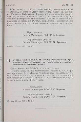 Постановление Совета Министров РСФСР. О присвоении имени В.И. Ленина Челябинскому тракторному заводу Министерства тракторного и сельскохозяйственного машиностроения. 15 мая 1968 г. № 318