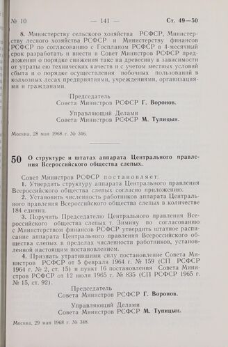 Постановление Совета Министров РСФСР. О структуре и штатах аппарата Центрального правления Всероссийского общества слепых. 29 мая 1968 г. № 348