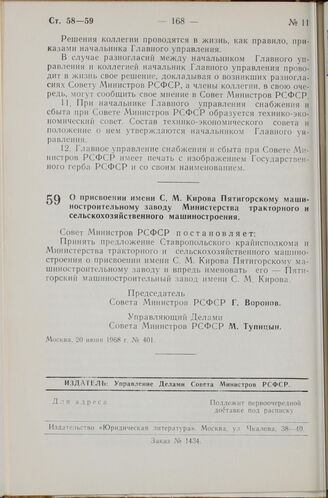 Постановление Совета Министров РСФСР. О присвоении имени С.М. Кирова Пятигорскому машиностроительному заводу Министерства тракторного и сельскохозяйственного машиностроения. 20 июня 1968 г. № 401