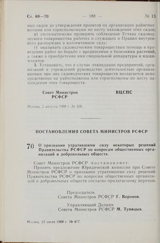 Постановление Совета Министров РСФСР. О признании утратившими силу некоторых решений Правительства РСФСР по вопросам общественных организаций и добровольных обществ. 23 июля 1968 г. № 477