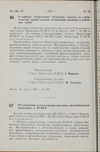 Постановление Совета Министров РСФСР. О порядке утверждения титульных списков на строительство зданий отделов (отделений) милиции и районных судов. 28 августа 1968 г. № 589