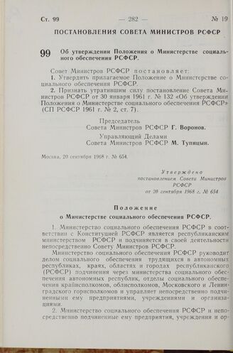 Постановление Совета Министров РСФСР. Об утверждении Положения о Министерстве социального обеспечения РСФСР. 20 сентября 1968 г. № 654