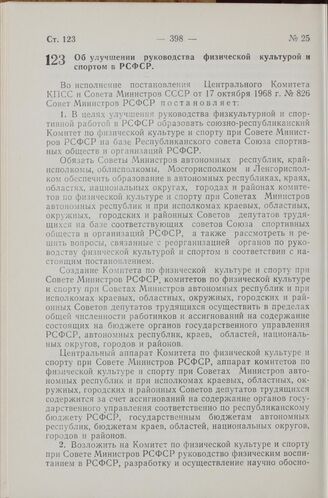 Постановление Совета Министров РСФСР. Об улучшении руководства физической культурой и спортом в РСФСР. 25 ноября 1968 г. № 750