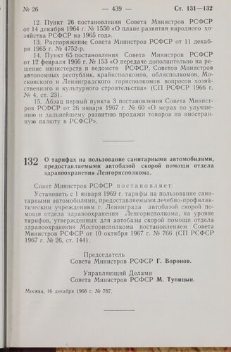 Постановление Совета Министров РСФСР. О тарифах на пользование санитарными автомобилями, предоставляемыми автобазой скорой помощи отдела здравоохранения Ленгорисполкома. 16 декабря 1968 г. № 787