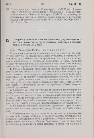 Постановление Совета Министров РСФСР. О порядке снижения такс на древесину, утратившую технические качества, и осуществления побочных пользований в колхозных лесах. 20 января 1969 г. № 49