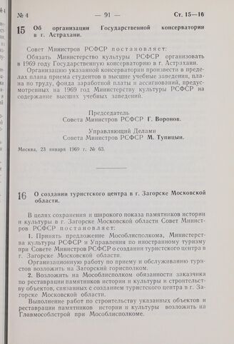 Постановление Совета Министров РСФСР. О создании туристского центра в г. Загорске Московской области. 24 января 1969 г. № 64