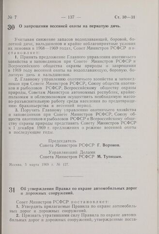 Постановление Совета Министров РСФСР. Об утверждении Правил по охране автомобильных дорог и дорожных сооружений. 5 марта 1969 г. № 129