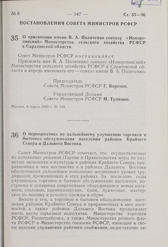 Постановление Совета Министров РСФСР. О присвоении имени В.А. Поляченко совхозу «Новорепинский» Министерства сельского хозяйства РСФСР в Саратовской области. 6 марта 1969 г. № 134