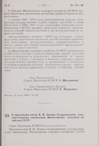 Постановление Совета Министров РСФСР. О присвоении имени В.И. Ленина Астраханскому государственному заповеднику Министерства сельского хозяйства СССР. 17 марта 1969 г. № 162