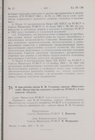 Постановление Совета Министров РСФСР. О присвоении имени В.И. Ульянова совхозу «Николаевский» Министерства сельского хозяйства РСФСР в Ульяновской области. 4 июня 1969 г. № 339