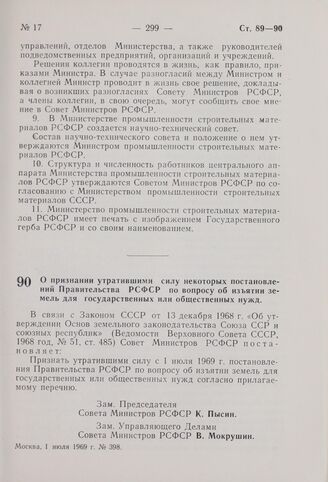 Постановление Совета Министров РСФСР. О признании утратившими силу некоторых постановлений Правительства РСФСР по вопросу об изъятии земель для государственных или общественных нужд. 1 июля 1969 г. № 398