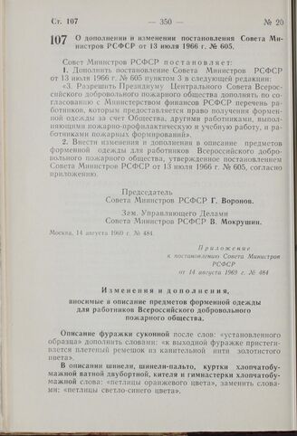 Постановление Совета Министров РСФСР. О дополнении и изменении постановления Совета Министров РСФСР от 13 июля 1966 г. № 605. 14 августа 1969 г. № 484