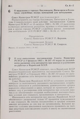 Постановление Совета Министров РСФСР. О ходе выполнения постановления Совета Министров РСФСР от 9 февраля 1965 г. № 207 «О мерах по дальнейшему развитию сети интернатов при школах и улучшению их работы» в Марийской АССР. 16 декабря 1969 г. № 673