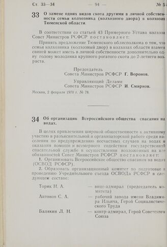 Постановление Совета Министров РСФСР. О замене одних видов скота другими в личной собственности семьи колхозника (колхозного двора) в колхозах Тюменской области. 2 февраля 1970 г. № 78
