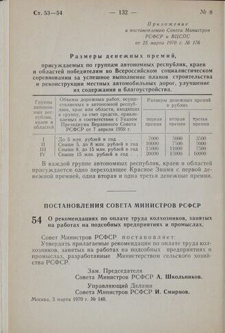 Постановление Совета Министров РСФСР. О рекомендациях по оплате труда колхозников, занятых на работах на подсобных предприятиях и промыслах. 3 марта 1970 г. № 140