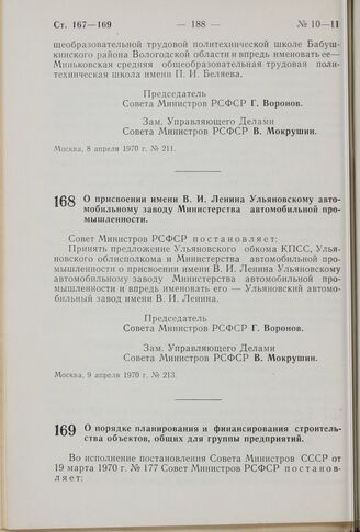 Постановление Совета Министров РСФСР. О порядке планирования и финансирования строительства объектов, общих для группы предприятий. 9 апреля 1970 г. № 216