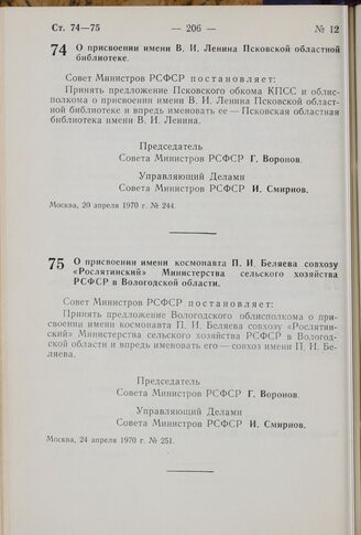 Постановление Совета Министров РСФСР. О присвоении имени космонавта П.И. Беляева совхозу «Рослятинский» Министерства сельского хозяйства РСФСР в Вологодской области. 24 апреля 1970 г. № 251