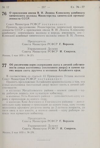 Постановление Совета Министров РСФСР. О присвоении имени В.И. Ленина Клинскому комбинату химического волокна Министерства химической промышленности СССР. 5 мая 1970 г. № 271