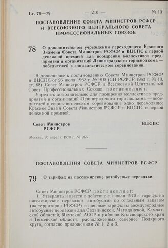 Постановление Совета Министров РСФСР. О тарифах на пассажирские автобусные перевозки. 20 апреля 1970 г. № 237