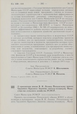 Постановление Совета Министров РСФСР. О присвоении имени В.И. Ленина Пензенскому ордена Трудового Красного Знамени совхозу-техникуму Министерства сельского хозяйства РСФСР. 5 августа 1970 г. № 472