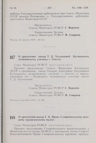 Постановление Совета Министров РСФСР. О присвоении имени Т.Д. Хахлыновой Калмыцкому медицинскому училищу г. Элисты. 3 сентября 1970 г. № 520
