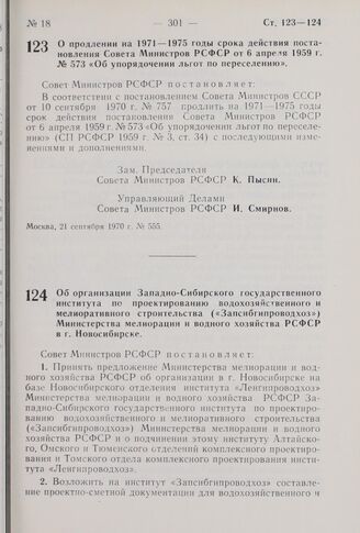 Постановление Совета Министров РСФСР. Об организации Западно-Сибирского государственного института по проектированию водохозяйственного и мелиоративного строительства («Запсибгипроводхоз») Министерства мелиорации и водного хозяйств РСФСР в г. Новосибирске. 23 сентября 1970 г. № 559