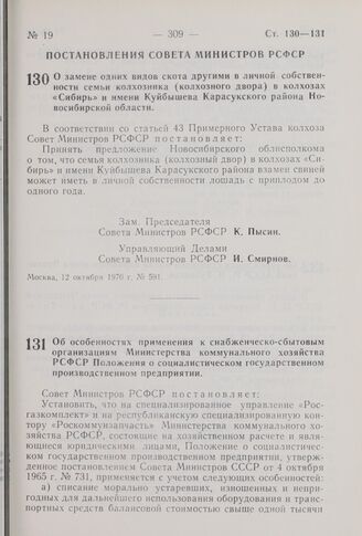 Постановление Совета Министров РСФСР. О замене одних видов скота другими в личной собственности семьи колхозника (колхозного двора) в колхозах «Сибирь» и имени Куйбышева Карасунского района Новосибирской области. 12 октября 1970 г. № 591