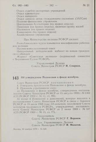 Постановление Совета Министров РСФСР. Об утверждении Положения о фонде всеобуча. 19 ноября 1970 г. № 649